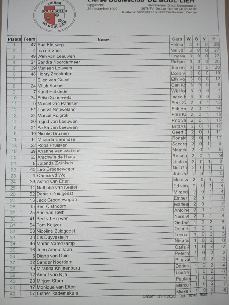 In oktober 2025 werd de Boul-Lier benaderd door Yvon van Paassen (dochter van ons aller Tinus van Etten) of het mogelijk was een jeu de boules middag te organiseren voor het ‘goede doel’. Samen met vriendin Karin Vos, die net terugkwam van een verschrikkelijke ziekte, wilde ze de Tourmalet gaan beklimmen en op die manier geld inzamelen voor Team Westland. Zo ontstond de groep “Fox on the Rocks”, die uitgroeide tot maar liefst 28 personen, die samen deze uitdaging aangaan. Even ter herinnering: Team Westland is een stichting met als doel het financieel ondersteunen van (regionale) instellingen en initiatieven die rechtstreeks of zijdelings verband houden met kanker: “Samen tegen kanker”. Een ontzettend mooi doel, waar de Boul-Lier natuurlijk graag een bijdrage aan zou leveren. Na overleg met de dames werd een datum geprikt en een vriendenprijs afgesproken, die later nog omlaag werd bijgesteld. Onder andere via flyers, de Boul-Lier website, mond-op-mond reclame en lokale nieuwsmedia werd aandacht geschonken aan het evenement, dat met 120 deelnemers al gauw volgeboekt was. Inschrijfgeld €25,- p.p. all-in. Dus inclusief alle hapjes en drankjes. Een heel mooie, volledig gesponsorde, prijzentafel en een heel gevarieerd deelnemersveld. Van amateurs aan wie eerst de spelregels moesten worden uitgelegd, tot (semi) profs die het spelletje vrijwel dagelijks beoefenen. Twee poules van 30 doublets elk, die op 15 relatief smalle banen de strijd aangaan. Drie wedstrijden van maximaal 25 minuten. Staat er na deze 25 minuten een gelijke stand op het scorebord, dan gooien beide teams in een barrage nog één boule om de winnaar te bepalen. Na elke partij worden de scores gemeld bij Koos, die ze direct in de laptop invoert, zodat zo snel mogelijk na ronde 3 de uitslag bekendgemaakt kan worden. Ook vandaag is deelnemen veel belangrijker dan winnen, zeker gezien het letterlijk en figuurlijk hogere doel, de Tourmalet. Hieronder vermelden we de top vijf, maar vele anderen mochten ook iets van de prijzentafel kiezen.