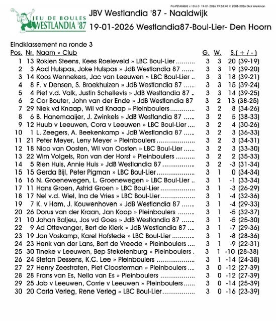 Wat ooit begon als een uitwisseling tussen Westlandia ’87 en LBC Boul-Lier is inmiddels uitgegroeid tot een gezellige driehoek met daarbovenop de spelers uit Den Hoorn. Twee keer per jaar komen de clubs samen: in januari bij Westlandia ’87 en in november bij LBC Boul-Lier. Omdat Den Hoorn geen overdekte accommodatie heeft, is deze samenwerking voor hen een mooie aanvulling op het speelseizoen. Elke vereniging komt met tien teams, waarbij Den Hoorn teams aanvult met spelers van Quintus en Midi. Ieder team speelt drie partijen. De tegenstanders worden door loting bepaald, met als enige regel dat je niet tegen een team van je eigen club speelt. Dat zorgt telkens voor verrassende duels en ontmoetingen. De sfeer is steevast ontspannen en vriendschappelijk, precies zoals deze uitwisseling bedoeld is. Na drie gespeelde partijen worden de scores verzameld en volgt de prijsuitreiking. De prijzen bestaan uit prachtige planten, die eerlijk worden verdeeld over de drie deelnemende verenigingen. De beste drie teams per club mogen een plant uitzoeken. Bij LBC de Boul-Lier waren de resultaten zeer uiteenlopend, van alle drie gewonnen partijen tot geen gewonnen partij. Maar een ding hadden de teams gemeen: het waren sportieve partijen. Er viel geen wanklank…. Kees Roeleveld en Rokien Steenks eindigden zelfs als beste team van het hele toernooi. Daarnaast mochten ook Koos Wennekers en Jacques van Leeuwen, én Huib en Cora van Leeuwen een plant mee naar huis nemen voor hun 1e, 2e en 3e plaats binnen de club.